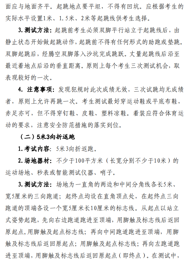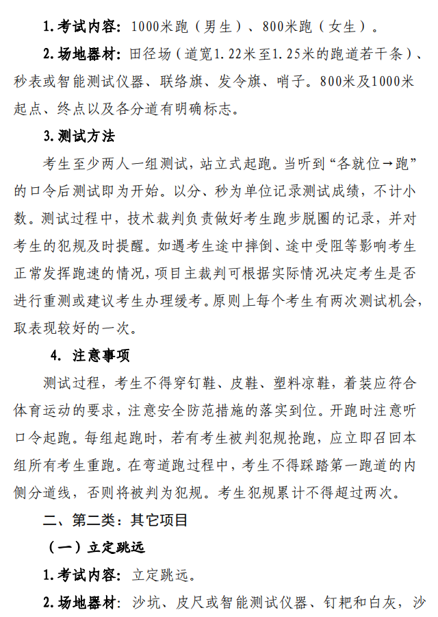 第一类:3分钟跳绳、1000 米跑(男生)、800米跑(女生)。 第二类:立定跳远、5米3向折返跑、原地双手头上前掷实心球。 |