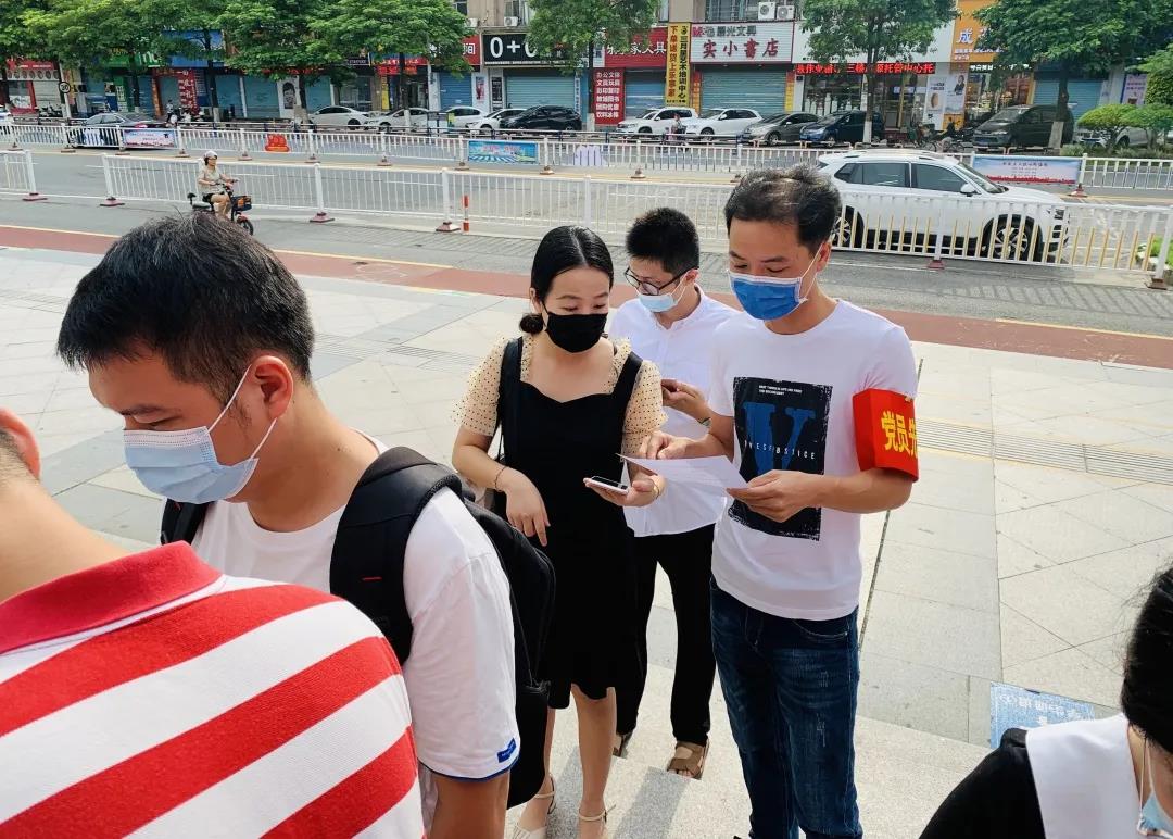 在新任教师自主择岗现场,党员先锋岗认真查验行程码、测温等,做好现场秩序维护,确保择岗现场规范操作。