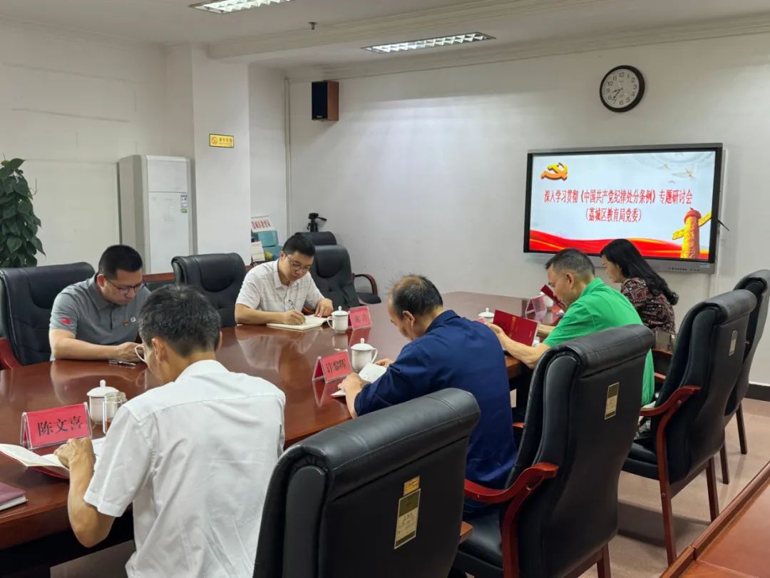 为深入学习贯彻习近平总书记关于党纪学习教育的重要讲话和重要指示精神,4月29日,荔城区教育局党委(党组)理论学习中心组召开《中国共产党纪律处分条例》专题学习研讨会。党委(党组)书记、局长陈于涵主持会议,并领学《中国共产党纪律处分条例》第一章、第二章。各党委委员围绕《条例》结合自身工作实际做研讨发言。区委组织部部务会议成员、区委区直机关党工委委员陈青到会巡听旁听。