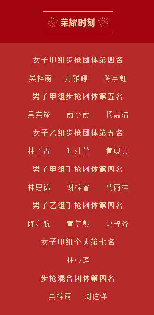 日前,福建省青少年电子枪射击锦标赛在闽清落幕。本次比赛共吸引了来自全省各地中小学校、体校以及体育俱乐部共30支代表队。荔城区第二实验小学射击队小运动员们,不畏强敌、奋力拼搏,勇夺团体第六名的好成绩。