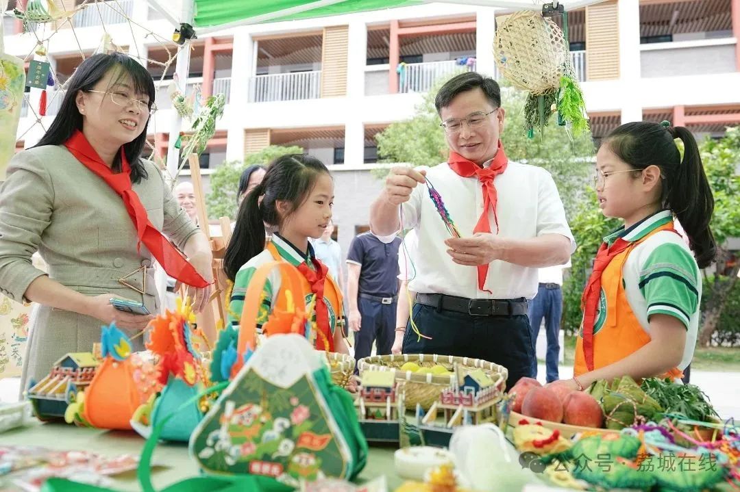 步入校园,智能类人机器人化身“文化使者”,与学生们热情迎宾,声情并茂地介绍校园文化底蕴。杨兴斌驻足倾听,对学校推动人工智能与基础教育深度融合的创新实践给予高度评价。移步展区,传统与科技交织的场景琳琅满目:彩绘蛋展台前,讲解员以端午习俗为引,将文化传承娓娓道来;图形化编程社团内,学生们用3D打印制作出数字龙舟与创意粽子,美术工坊中,AI生成的“20年后的职业照”视频引发阵阵惊叹……操场上,旱地龙舟数独赛掀起高潮,无人机载着香囊把祝福献给嘉宾。杨兴斌在学生的邀请下动手制作DIY香囊,参与投壶游戏,传统文化在指尖流转中生辉。丰园与润园内,投壶游戏的喝彩声、合唱团快闪的悠扬歌声此起彼伏,古老民俗与现代校园文化碰撞出温暖火花。活动中,杨兴斌为“爱心书屋”捐赠图书,强调要全力支持教育创新与特色发展,为儿童成长筑牢根基。