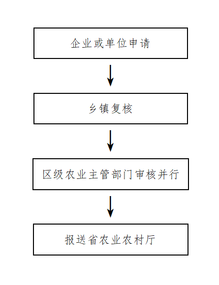 按照“企业或单位申请、乡镇复核、区级农业主管部门审核并行文上报、市级农业农村部门审核、报送省农业农村厅”的流程进行。