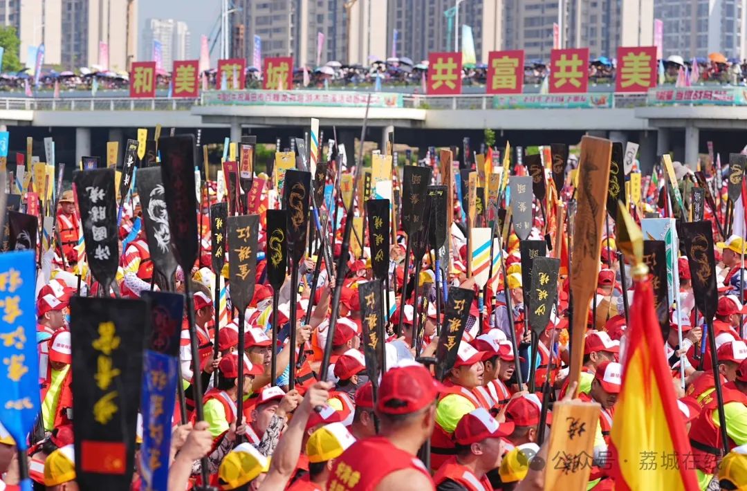 最激动人心的当属启动仪式环节。在全场热烈的掌声与欢呼声中,市、区领导付朝阳、陈惠黔、高宇、何金清、杨兴斌等上台共同将象征着希望与力量的水注入龙舟道具中。