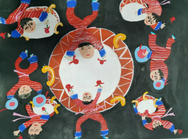 小朋友们用农民画朴实的绘画语言、大红大紫的色彩、简洁明快的风格寓意深刻的主题,将“年俗”元素组合在一幅幅画作之中,淋漓尽致地表现出中国春节的年味,彰显出中国人在辞旧迎新之际的勃勃生机和对生活的热爱。