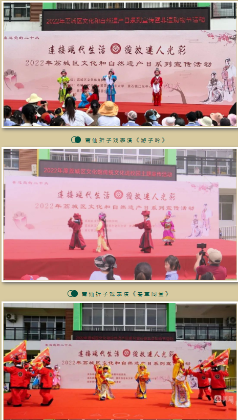 为了进一步传承弘扬中华优秀传统文化,提高非遗保护意识,更好根据地域特色、文化风格和资源特点,倡导“非遗传承从娃娃抓起”的保护理念,让非遗文化走近校园,让孩子们在活动中感受当地的民俗风情。日前,由荔城区文化体育和旅游局主办,荔城区文化馆、黄石镇江东中心小学、莆田市老年大学承办的“连接现代生活 绽放迷人光彩”2022年文化和自然遗产日宣传活动走进莆仙戏曲之乡、江梅妃故里黄石镇江东村,在江东中心幼儿园隆重举行。