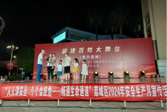 今年6月是第23个全国“安全生产月”。6月25日晚,围绕“人人讲安全、个个会应急——畅通生命通道”的主题,由荔城区文化体育和旅游局主办,荔城区文化馆承办的2024年安全生产月宣传活动在正荣时代广场举办。