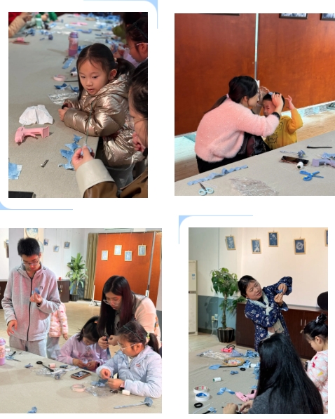 活动伊始,玉英老师先为大家展示了折叠和塑形的基础方法,小朋友们学得有模有样。他们将扎染布一层一层地折叠起来,小手灵活地摆弄着布料,努力让每一层都整齐有序。家长们则在一旁仔细观察,适时地伸出援手,帮忙调整角度、捏紧边缘。家长便耐心地帮助他们将布料折叠、缝合,再用热熔胶枪将其固定在发箍上,一个俏皮可爱的扎染蝴蝶结发饰就初具雏形。小朋友们迫不及待地戴在头上,眼中闪烁着光芒,还不忘询问身旁的小伙伴好不好看。