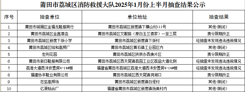 为深入推进全区火灾防控工作,进一步预防和减少火灾危害,保障公共安全,督促各单位、各场所履职尽责,根据《中华人民共和国消防法》、《消防监督检查规定》等有关法律法规规定,莆田市荔城区消防救援大队依法对荔城区机关、团体、企业、事业单位进行消防监督抽查,现将1月1日至15日“双随机一公开”消防监督抽查结果公示如下: