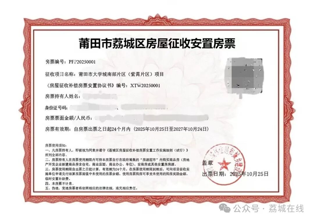 10月26日,荔城区西天尾镇的被征收群众黄女士从镇工作人员手中接过了全区首张《莆田市荔城区房屋征收安置房票》,这标志着荔城区房屋征收“房票安置”政策正式落地实施。