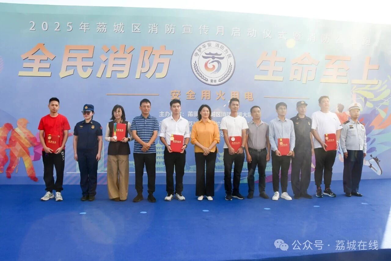 启动仪式上还对在近期全区基层消防力量业务比武竞赛中获奖的镇(街道)及重点单位代表队进行表彰,同时为荣获荔城区2025年度“最美消防志愿者”称号的个人颁发了证书,以此肯定他们在基层消防安全工作和公益宣传中的突出贡献。