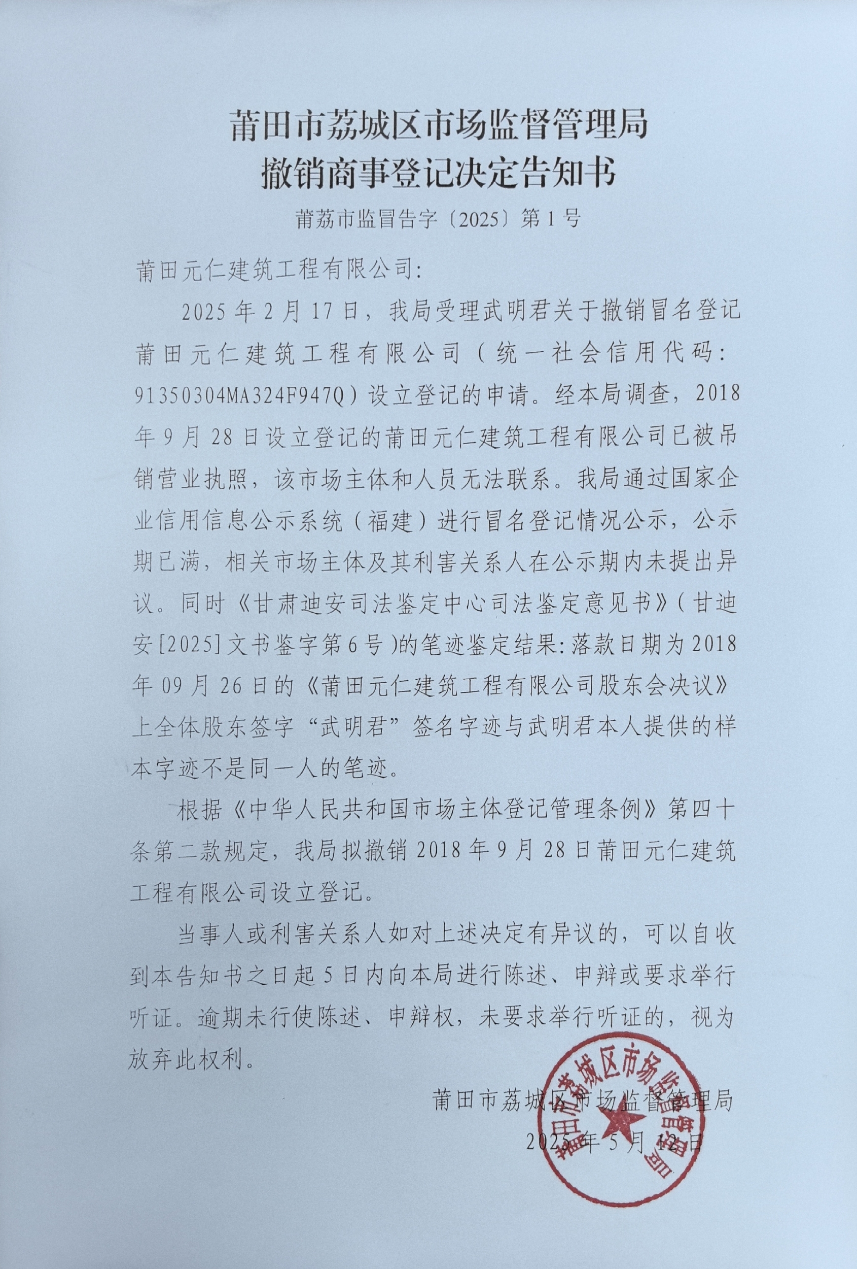 经本局调查,2018年9月28日设立登记的莆田元仁建筑工程有限公司(统一社会信用代码:91350304MA324F947Q)已被吊销营业执照,该市场主体和人员无法联系;我局通过国家企业信用信息公示系统(福建)进行冒名登记情况公示,公示期满,相关市场主体及其利害关系人未提出异议;《甘肃迪安司法鉴定中心司法鉴定意见书》(甘迪安[2025]文书鉴字第6号)的笔迹鉴定结果:落款日期为2018年09月26日的《莆田元仁建筑工程有限公司股东会决议》上全体股东签字“武明君”签名字迹与武明君本人提供的样本字迹不是同一人的笔迹。