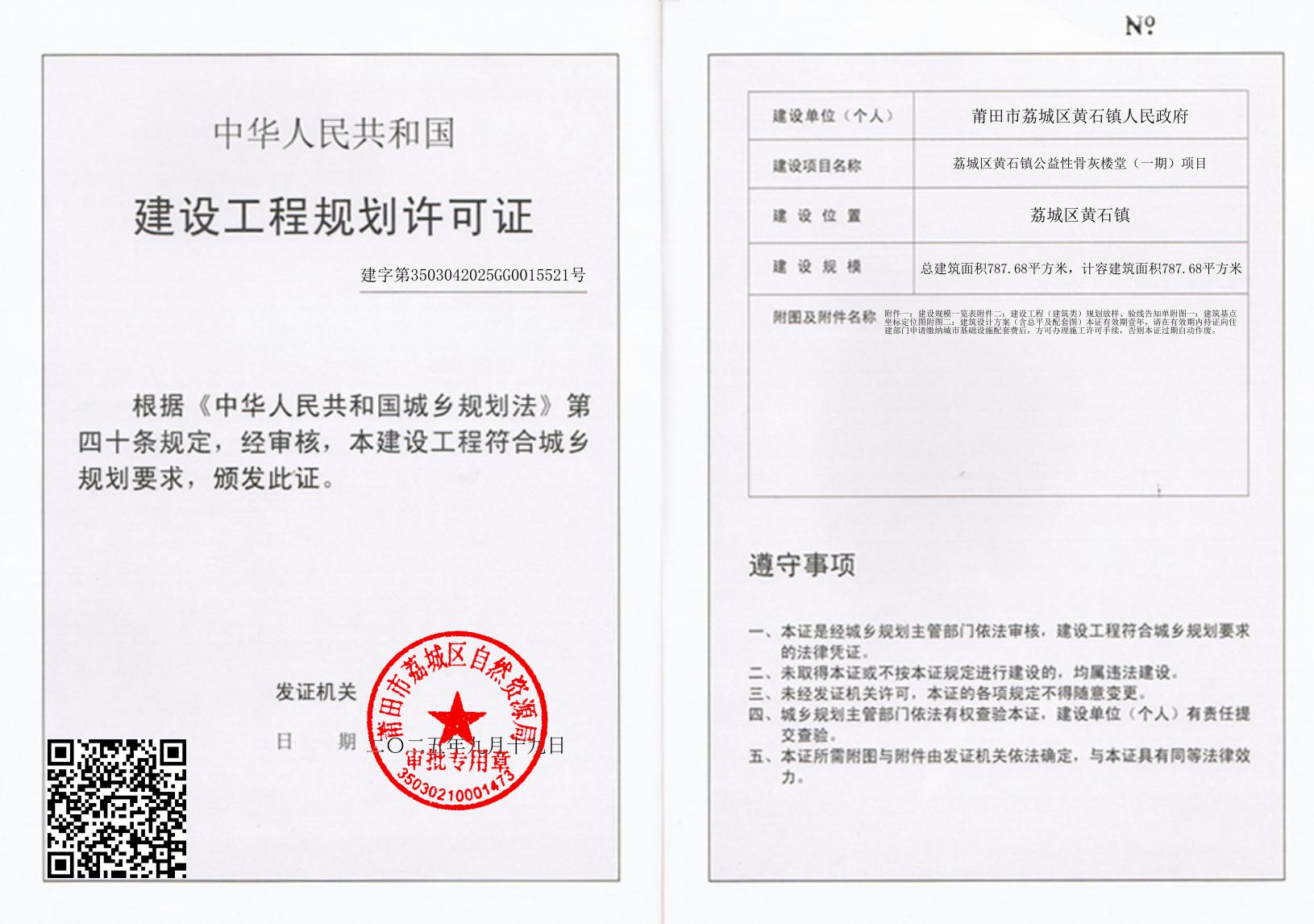 | 4 | 莆田市荔城区黄石镇人民政府 | 荔城区黄石镇公益性骨灰楼堂 | 建设工程规划许可证 | 2025/9/19 | 建字第3503042025GG0015521号 |
